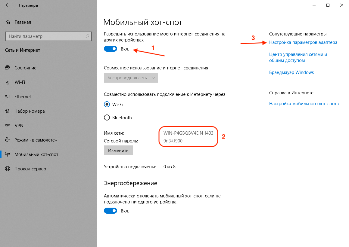 Включите мобильный хот-спот (1). Вы увидите название сети и пароль для подключения (2). Подключитесь к этой Wi-Fi сети на вашем устройстве. Пока что Wi-Fi сеть будет без VPN, поэтому нам нужно сообщить компьютеру, что мы хотим пропускать трафик через VPN. Для этого переходим по ссылке Настройка параметров адаптера (3).