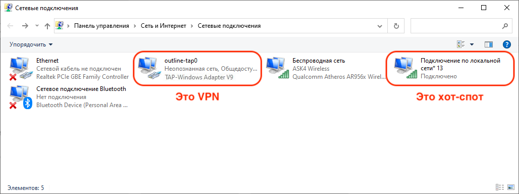 При переходе по ссылке "Настройка параметров адаптера" у вас откроется окно "Сетевые подключения". Здесь нам нужно обратить внимание на два адаптера. Первый называется outline-tap0 – это адаптер от VPN Дяди Вани. Второй будет называться "Подключение по локальной сети *##", где вместо решёток будут цифры. У нас на скриншоте это цифры 13, у вас они могут быть другими – это адаптер мобильного хот-спота.