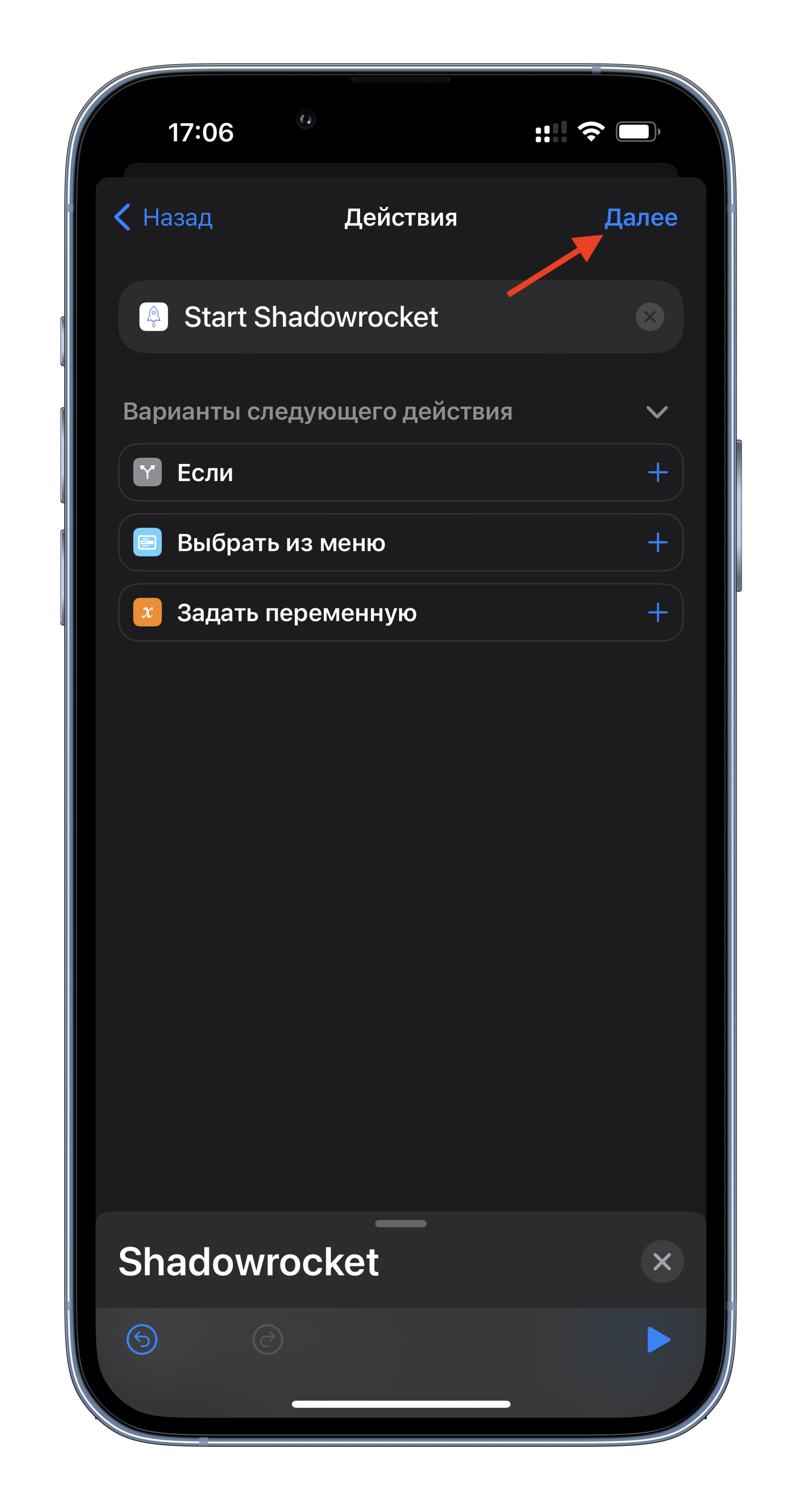 Теперь нужно выбрать, какое действие будет выполняться при запуске выбранных приложений. Зайдём во вкладку «Приложения» и выберем там «Shadowrocket». Затем выберем «Start Shadowrocket»