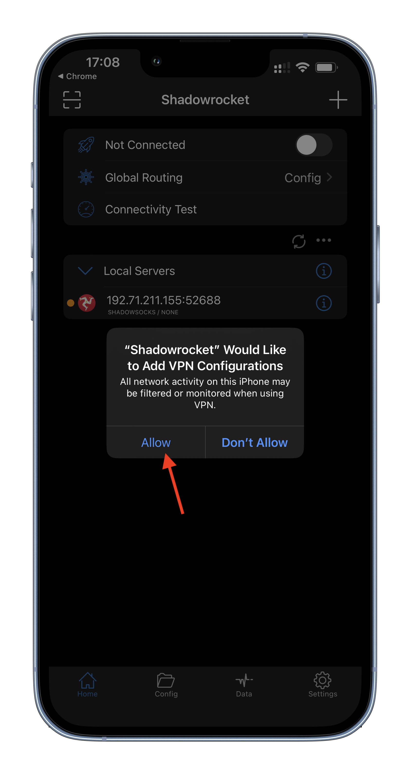 Зайдём в приложение, которое мы выбрали при создании автоматизации. В нашем примере это был Google Chrome. В первый раз система попросит установить VPN-адаптер. Нажмите «Разрешить» и подтвердите паролем от телефона.