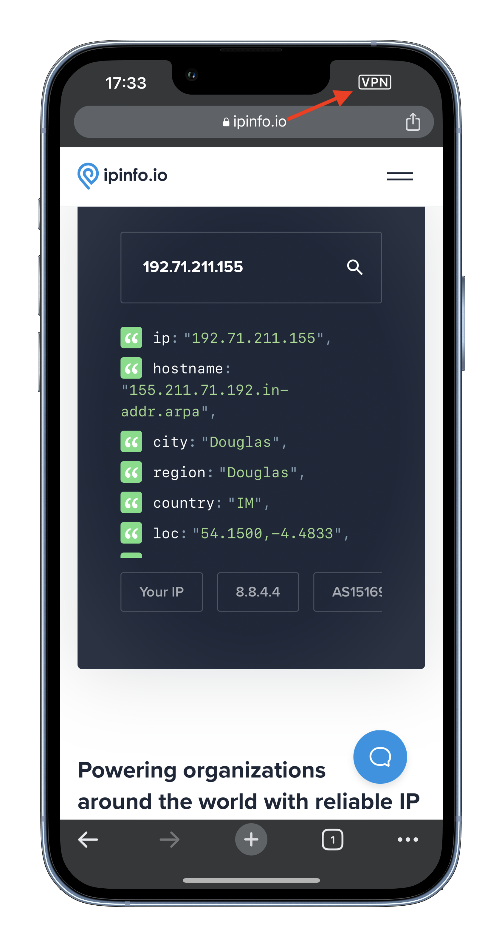 Всё, на этом настройка полностью завершена. Теперь снова зайдём в приложение, которое вы указывали в автоматизации. В верхнем меню появится значок VPN, что означает, что VPN включился. В нашем случае мы делали автоматизацию на приложении Chrome, поэтому зайдём на сайт ipinfo.io, чтобы проверить наш IP-адрес и убедиться, что он не российский.